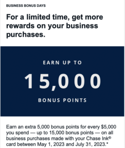 - Business bonus days are here! Earn up to 15,000 bonus points. Activate to earn an extra 5,000 bonus points for every $5,000 you spend — up to 15,000 bonus points — on all business purchases made with your Chase business card between May 1, 2023 and July 31, 2023.