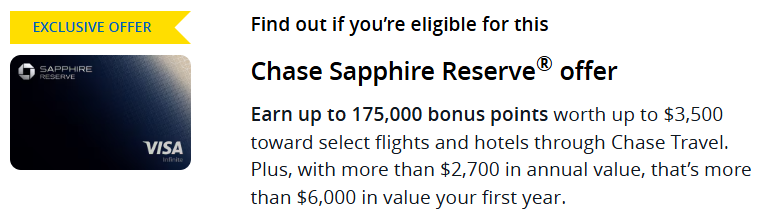- Chase is offering up to 175,000 points on the Chase Sapphire Reserve