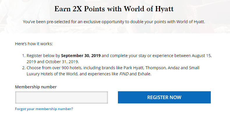 - Hyatt is offering some members double points on all stays from August 15th until October 31st, 2019. Must register by September 30th, 2019