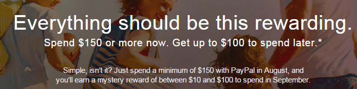 - Spend $150 online, anywhere that Paypal is accepted during the month of August and receive a mystery award of $10, $15, $25 or $100. Bonus will be applied to your next purchase in September and cannot be withdrawn as cash, it must be used within
