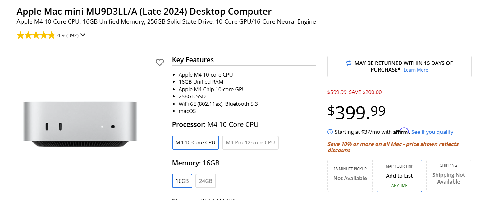 - Select Micro Center stores are selling the Apple Mac mini MU9D3LL/A M4 10-Core CPU; 16GB Unified Memory; 256GB Solid State Drive; 10-Core GPU/16-Core Neural Engine for $399.99