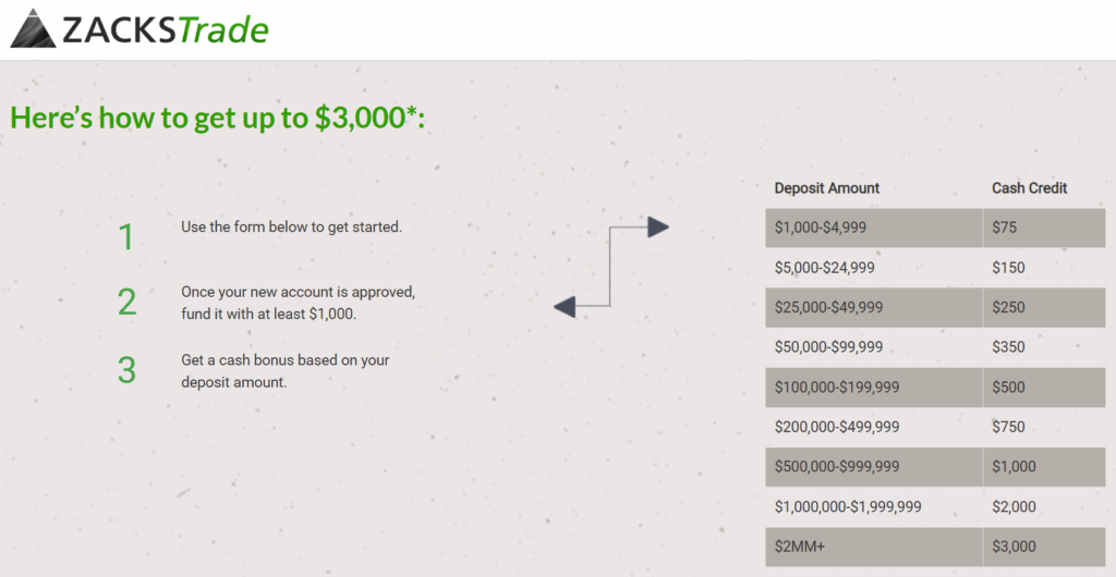 - Zacks Trade is offering a brokerage bonus of up to $3,000. Bonus tiers as follows: