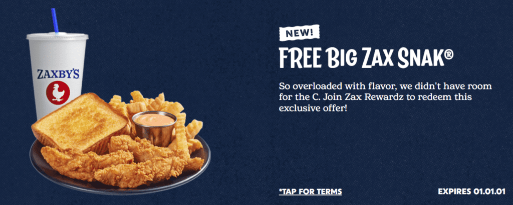 - Zaxby’s is offering a free big zax snak when you join the Zax Club (free to join).